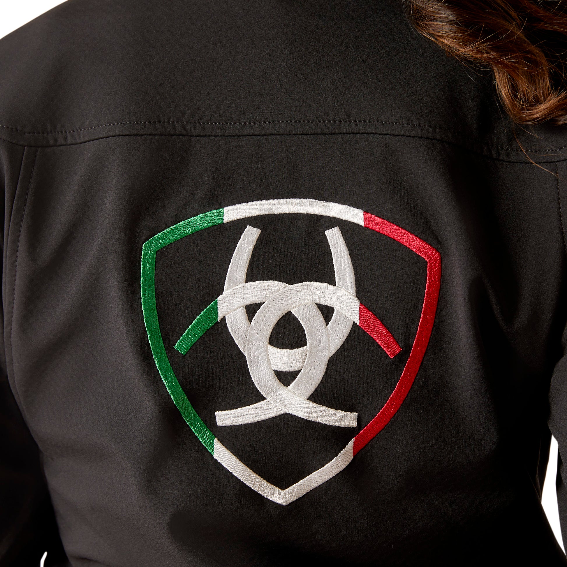 Ariat women’s black Team softshell with Mexican logo, stretch nylon and microfleece warmth, wind-resistant, water-repellent, zip pockets for rides daily.
