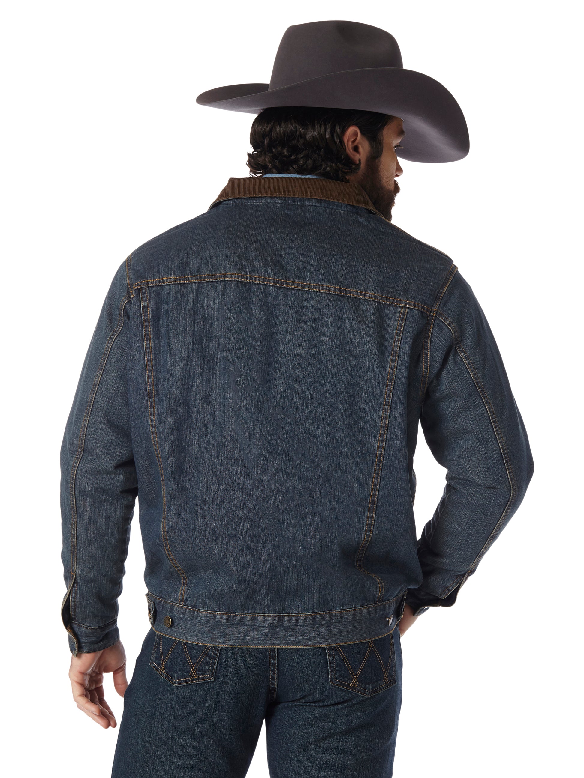 Warm flannel lined Wrangler denim jacket with corduroy collar, chest and hand pockets, perfect for ranch work, riding, or cool nights in town nightly.