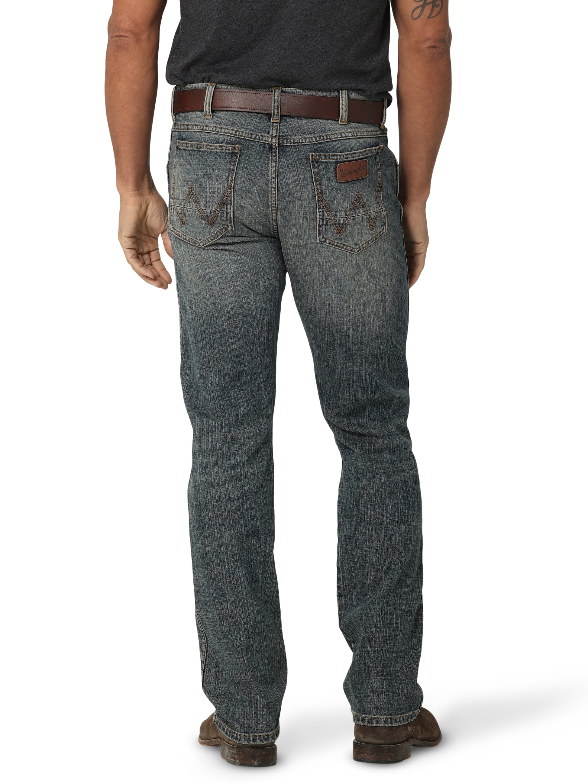 Wrangler® Retro® slim straight jeans sit low, flex with every move, and slide clean over boots for classic cowboy style in soft stretch denim all-day. Color Dark Knight.