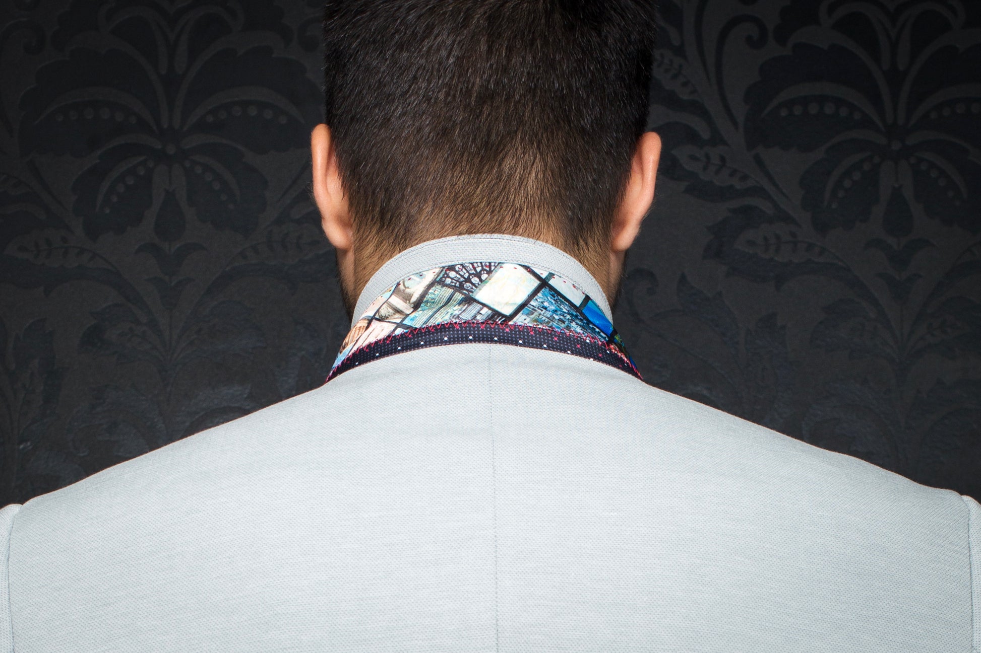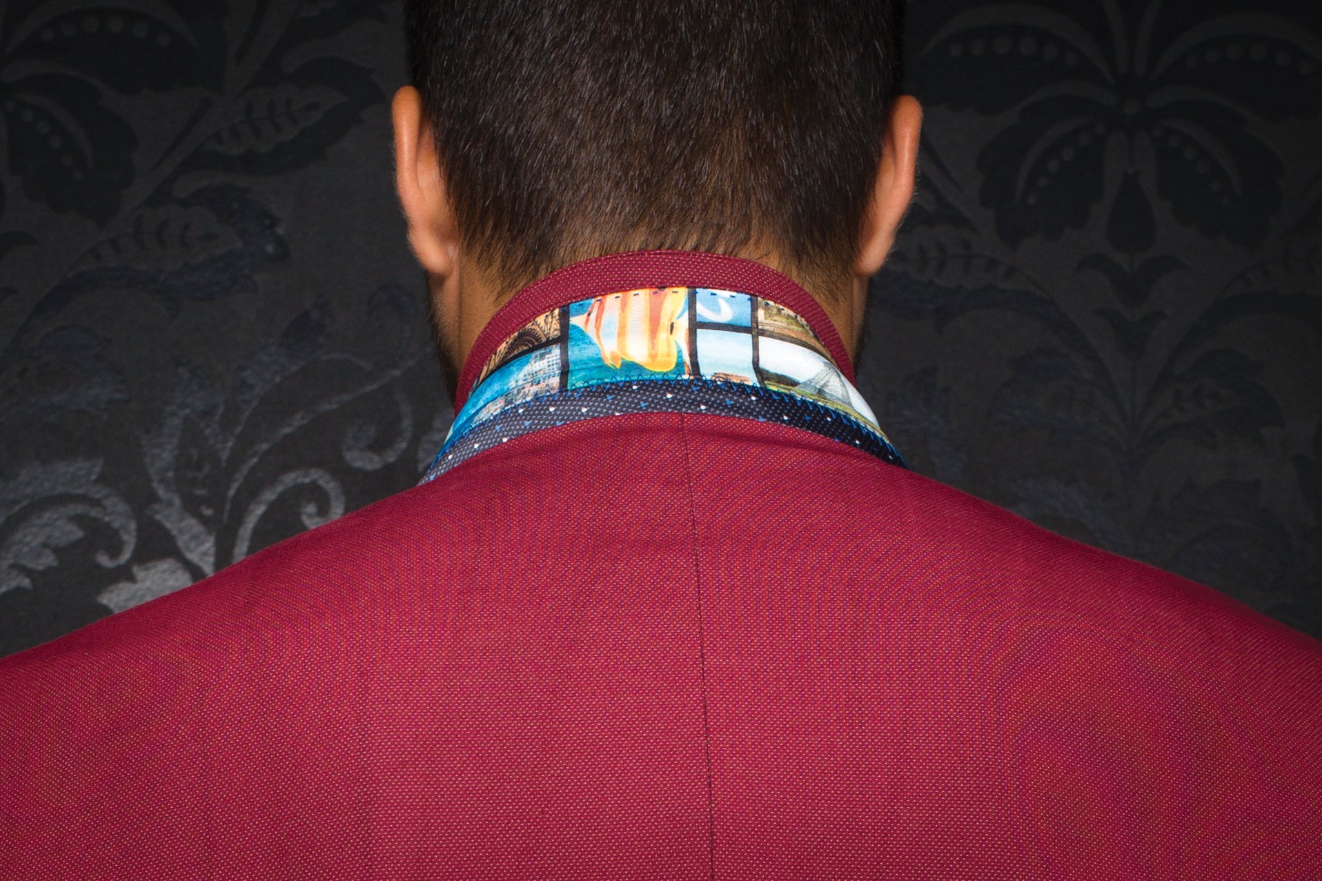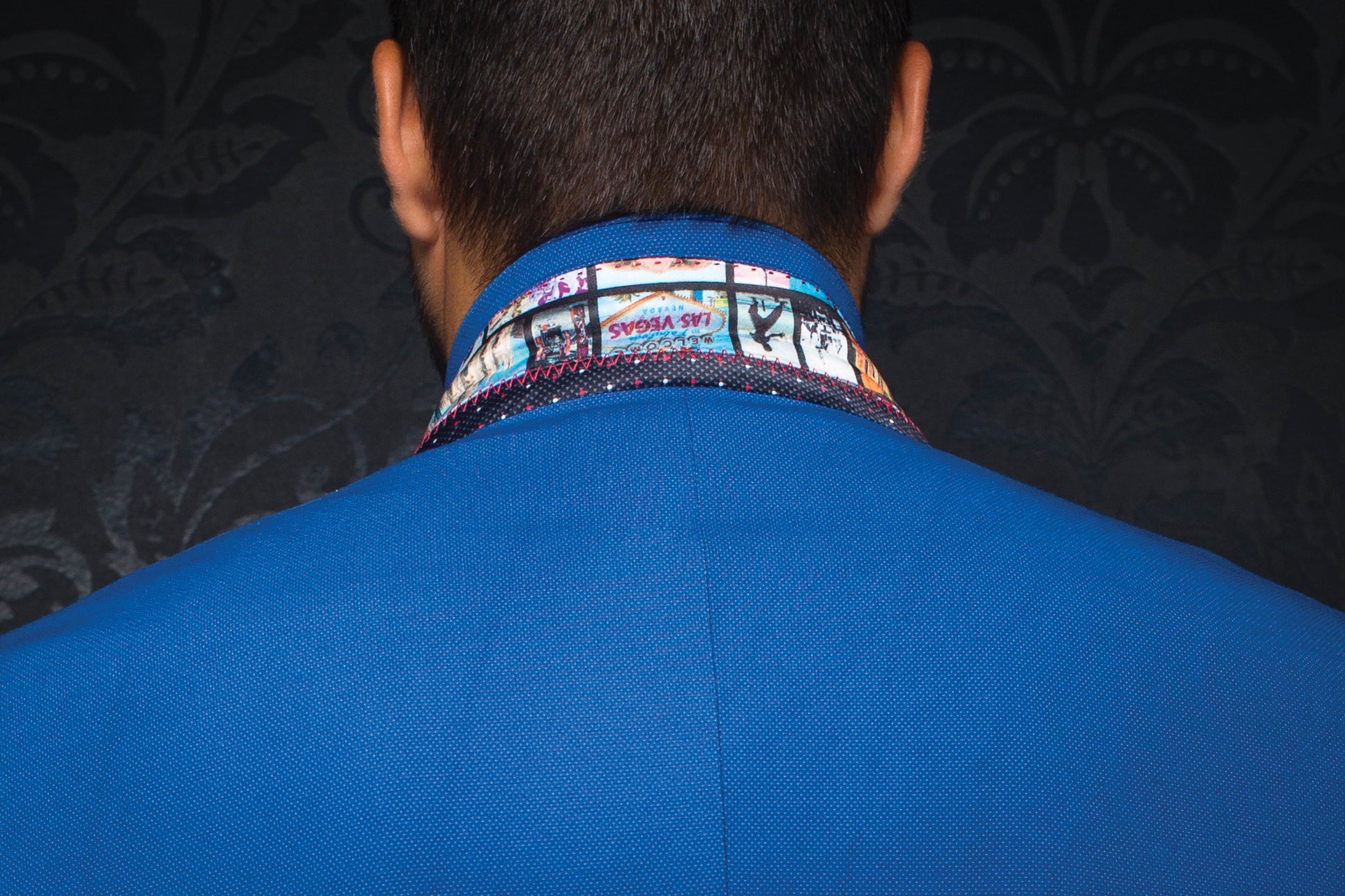 Stretchy men's blazer that's fashionable and comfy. Features Au Noir embroidery, special buttonhole, and patterned lining. Canada-designed with premium fabric for easy movement and 4-way stretch. Pair with jeans or shirts; dry clean. Includes handkerchief.