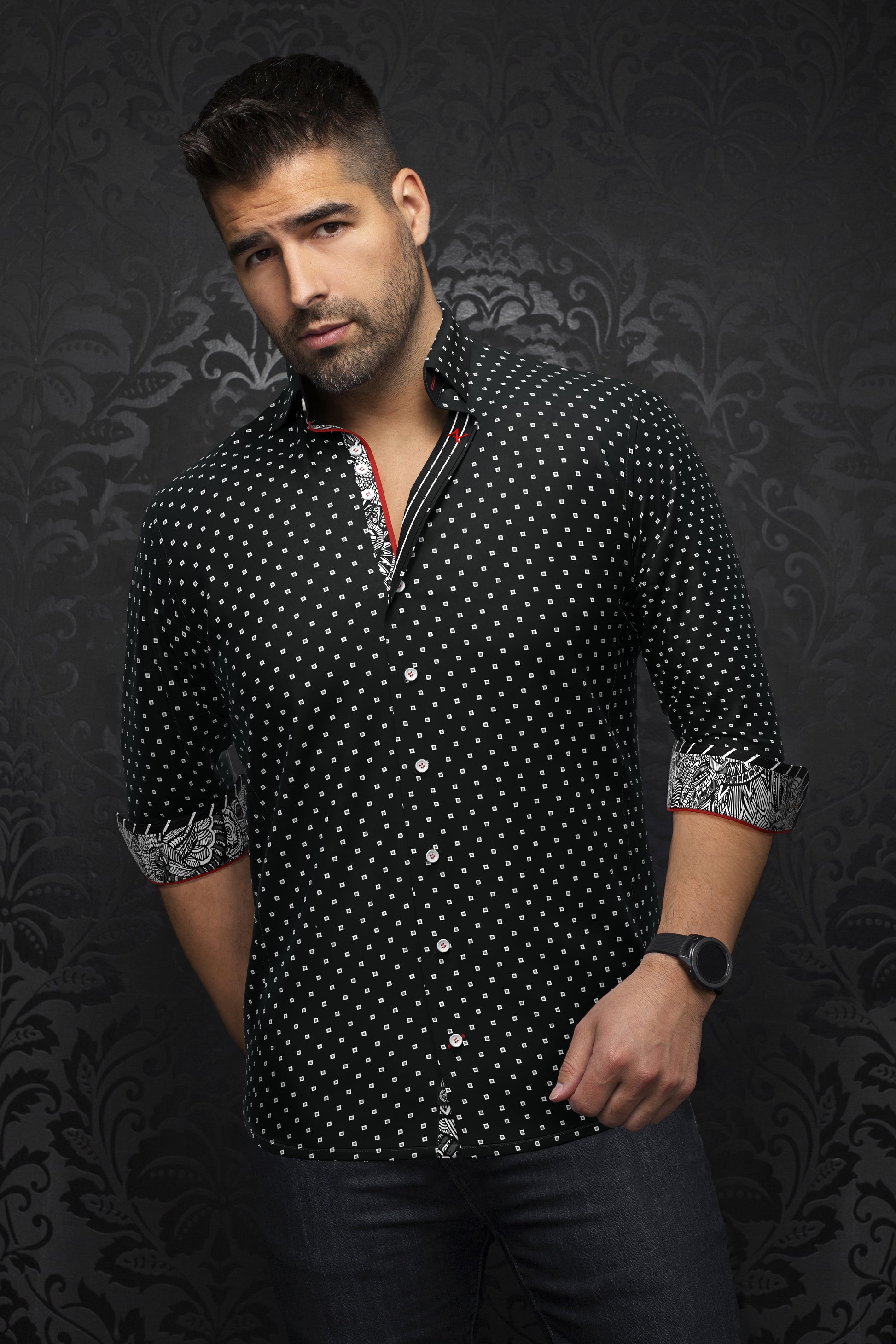 Au Noir's long-sleeve woven shirt mixes 98% cotton and 2% spandex for comfy stretch. Signature details include angled buttonholes, grouped buttons, embroidery, and ceramic sleeve buttons. Canadian brand; modern fit for tucked or untucked wear. Machine wash cold, hang dry.