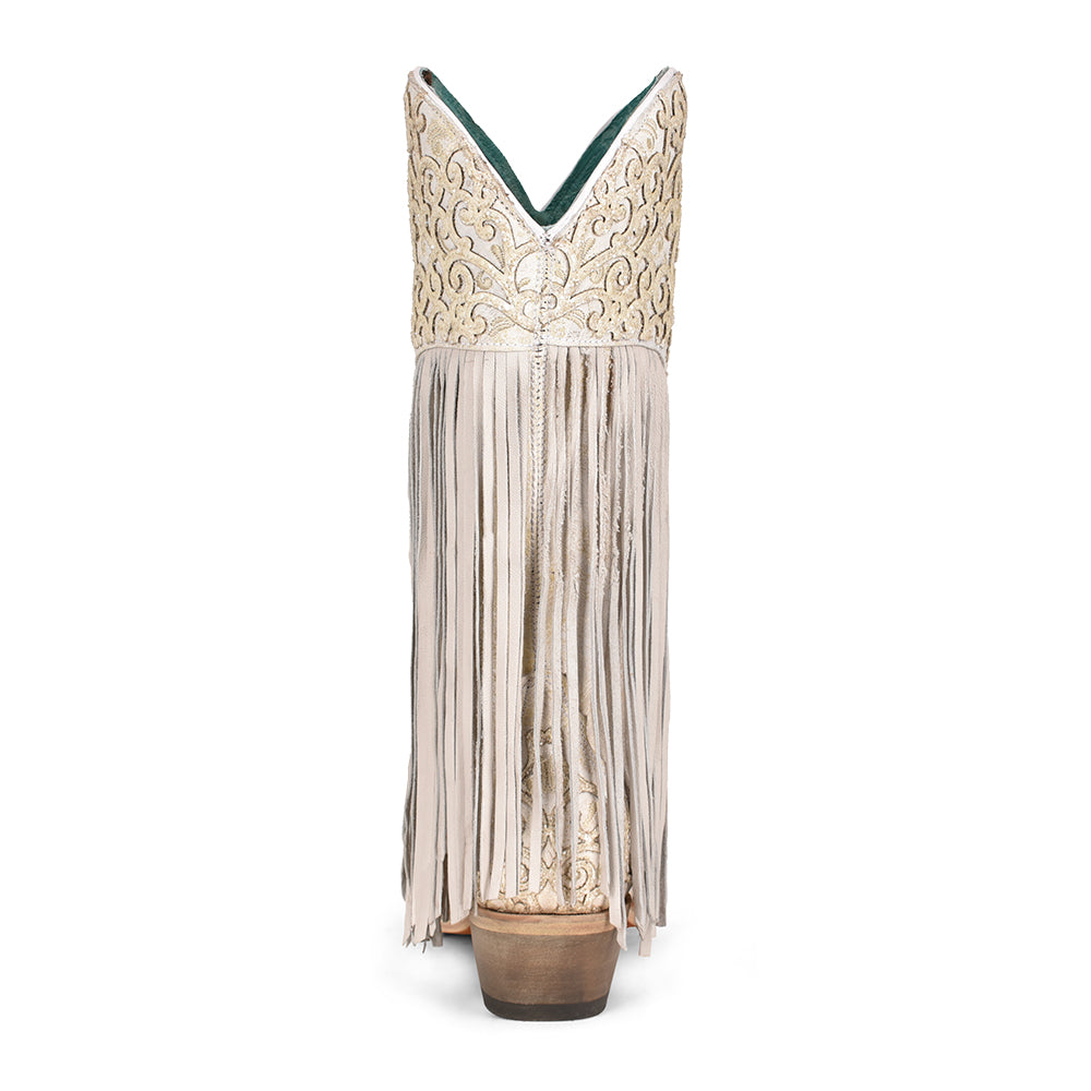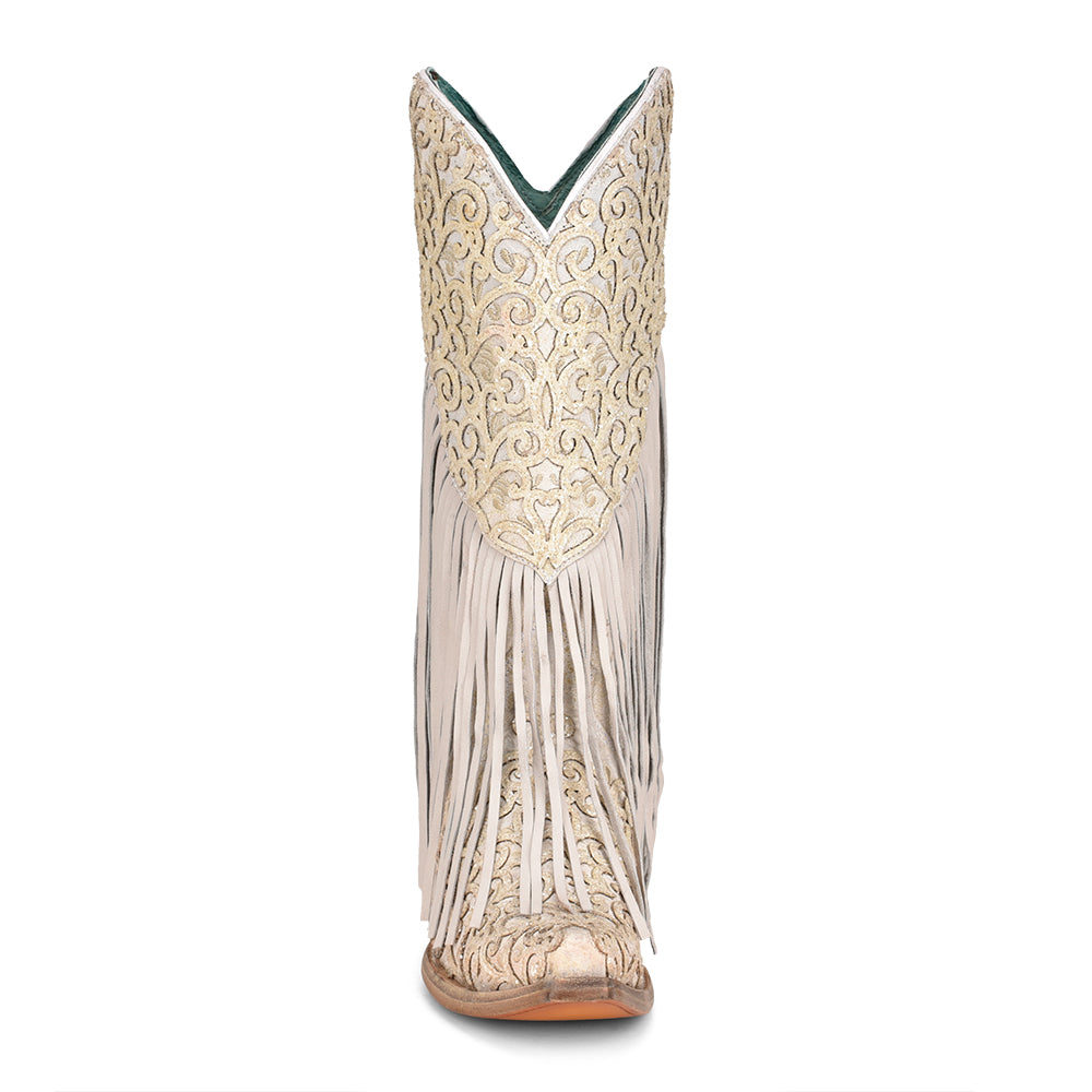 White Lamb Overlay & embroidery & fringe. Fun white lamb boot with 13-inch glitter-fringed shaft. Flirty pick for brides or festivals. All-day comfy: pull-on straps, snip toe, cushioned insole, leather sole, 2-inch heel.