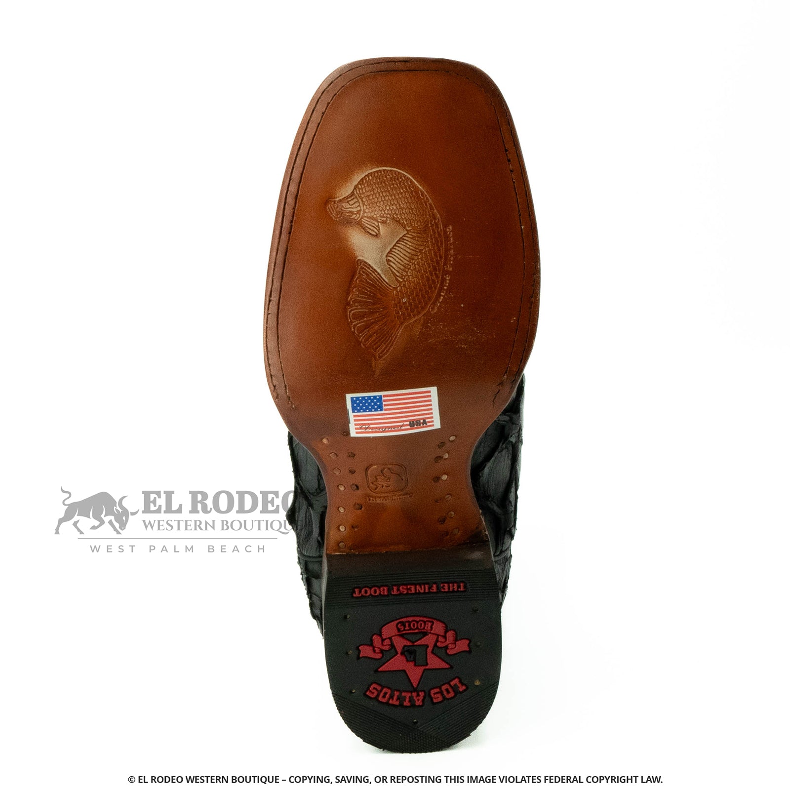 Los Altos men’s full pirarucu boot in bold black, wide square toe, rugged exotic skin, sleek comfort for nights out or off the saddle