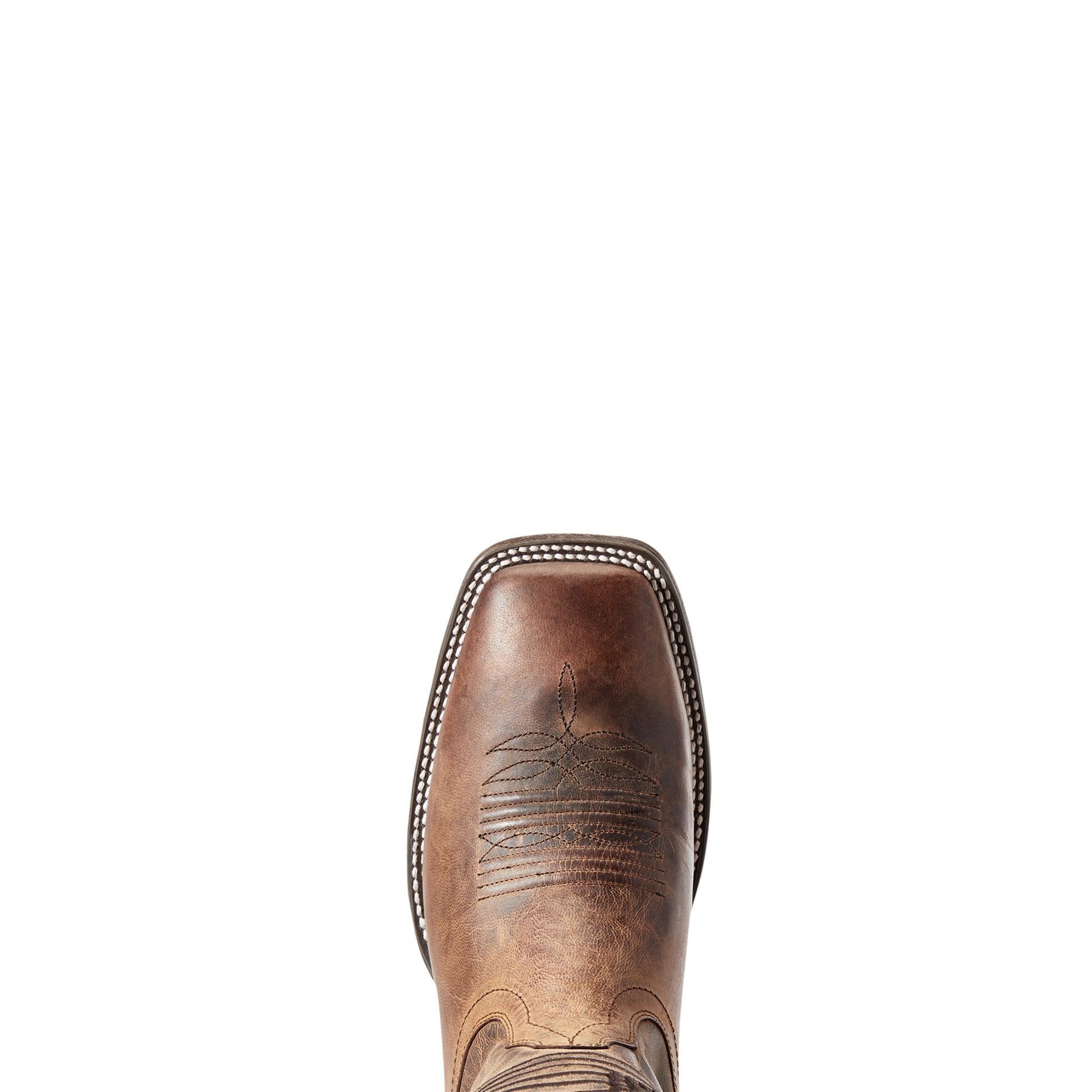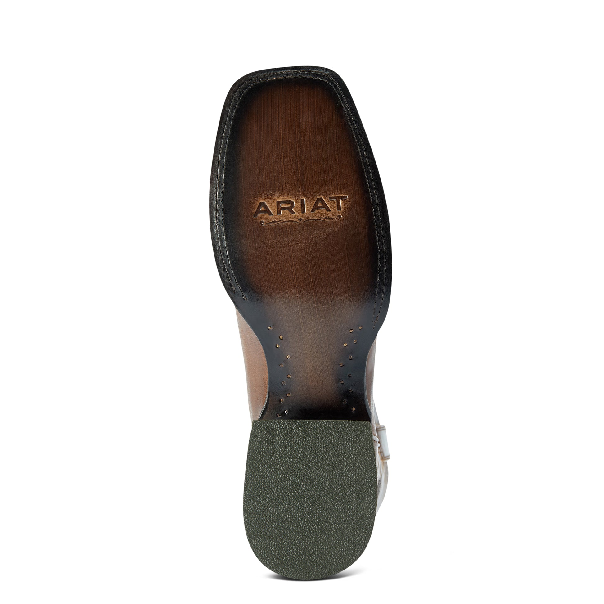 Traditional cowhide Ariat boot with flag detail, leather sole, Goodyear welt, and all-day comfort in a wide square toe fit. Built for daily wear use.