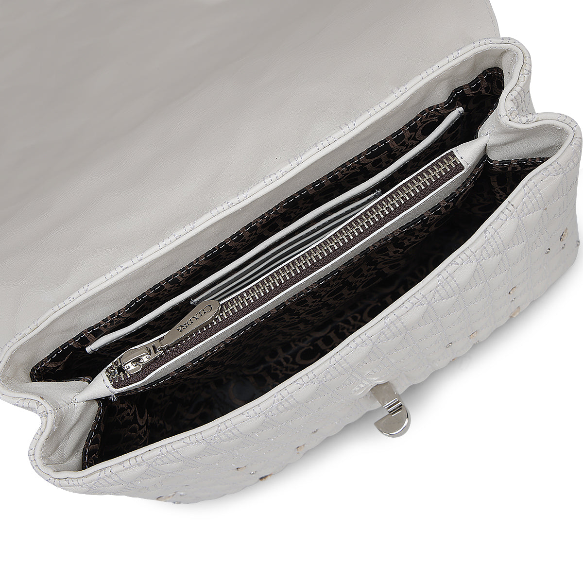 Turn heads with this white cowhide Cuadra bag, dressed in crystals, bold studs, and a handy zipper, perfect for modern Western-inspired outfits daily.